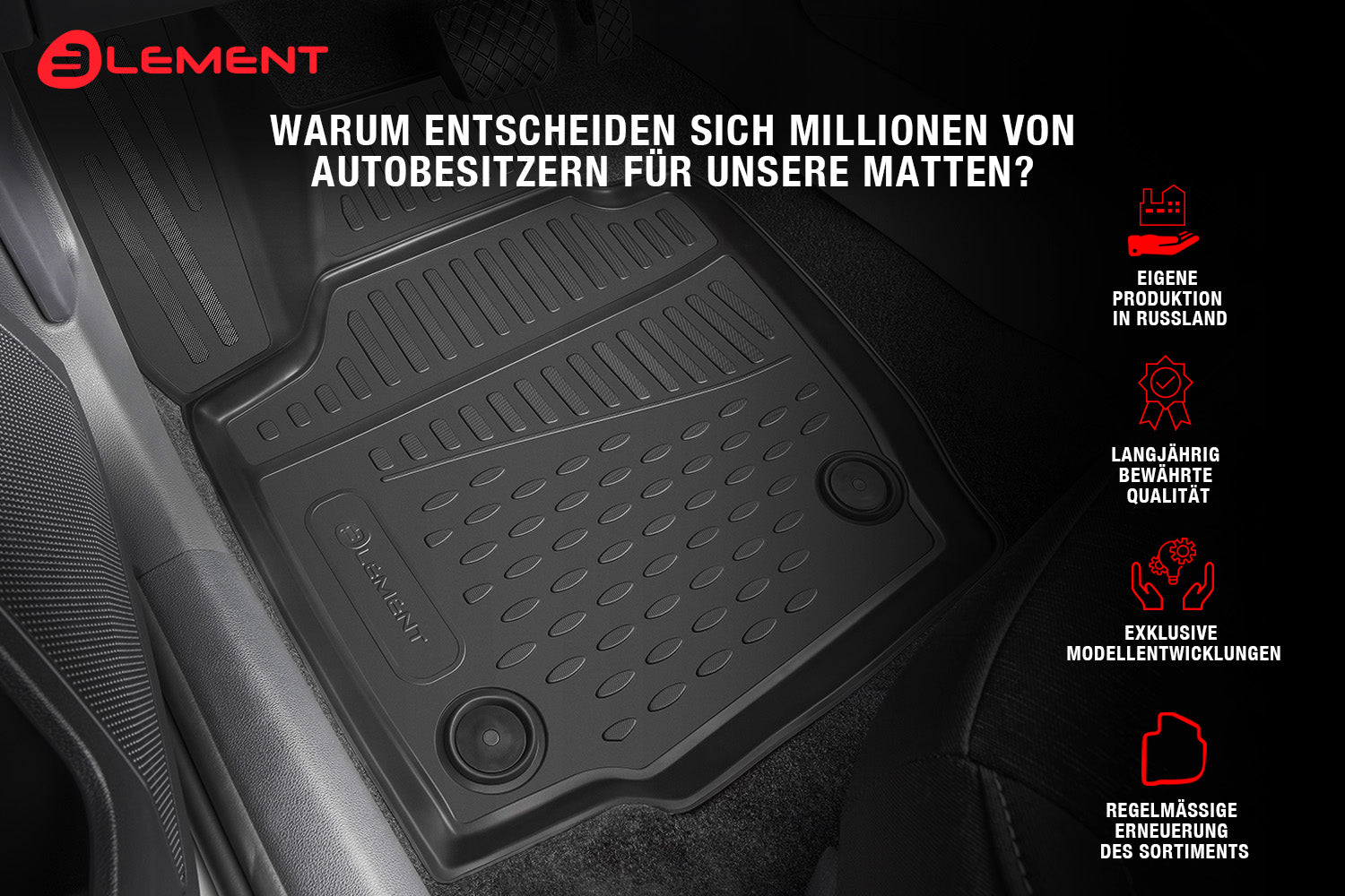 Die hochwertigen Gummi Fußmatten verfügen über spezielle abriebfeste Flachnoppen, die rutschhemmend wirken. Die Passform der Fußmatten ist speziell für Ihr Fahrzeug angepasst. Zusätzlich beinhalten die Matten schon spezielle Original Befestigungsknöpfe, wodurch die Installation sehr einfach ist.