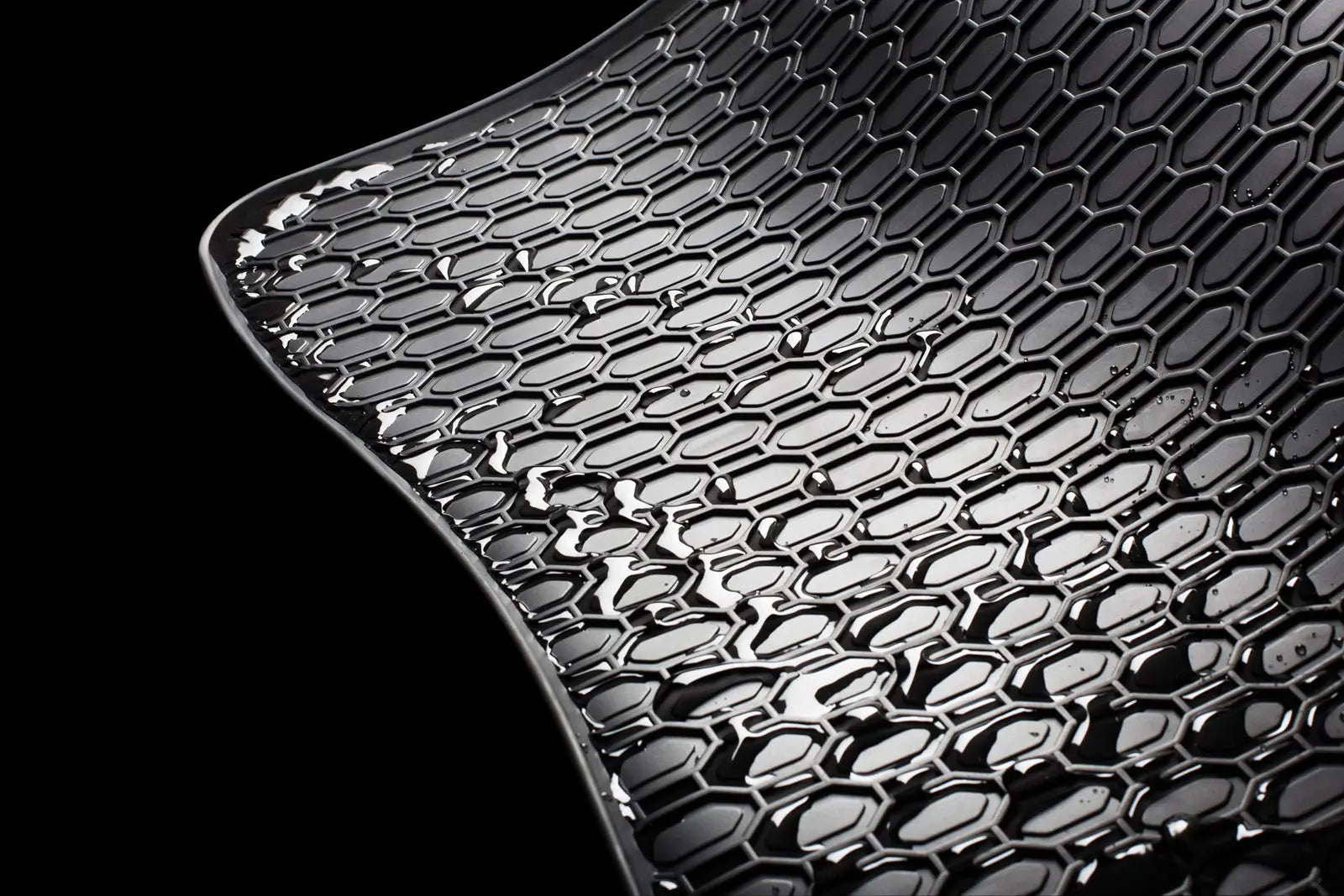 Die Fußmatten haben eine hochwertige Gummiqualität und garantieren dadurch eine hohe Lebensdauer. Durch die zusätzliche Verstärkung im Fußbereich sind die Autoteppiche ebenfalls langlebiger. Die Form der Fußmatten haben eine Honigwabenstruktur, welche die Bewegung von Wasser und Schmutz verhindern. Auf der Unterseite gibt es eine zusätzliche Antirutschbeschichtung, welche das Verrutschen während der Fahrt verhindern.